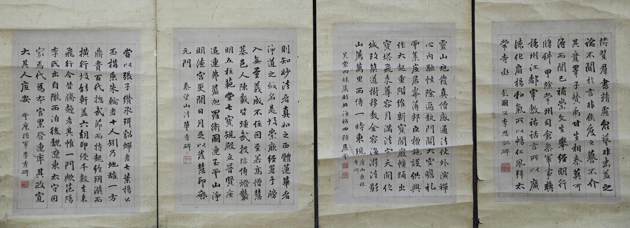 简述: 本藏品为纸本,立轴。是冯誉骥临李邕《李思训》、《李秀》、《法华寺》、《东林寺》四碑之作。从字里行间看出其作品笔力通劲、舒放、纵横开合, 丰润 而 不露锋芒 , 骨力寓于姿媚之内,意匠蕴涵于自然之势,内擫的笔势,遒丽爽健的线条 , 内藏肃穆之气 ,深得李北海险奇爽朗之书 风 。