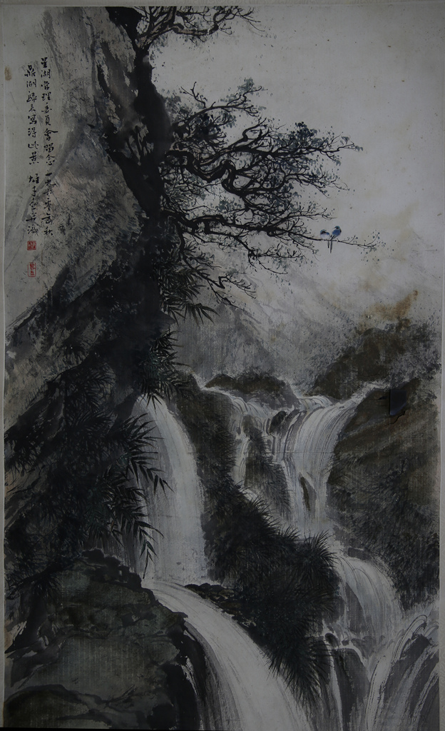 图中所绘,为广东肇庆鼎湖山飞水潭瀑布。瀑水层叠,如轻纱曼舞,又似奔雷溅雪;瀑旁崖壁草木横生,一枝盘悬而出的榕树枝中两只翠鸟正相对停歇。水纹轻逸,石皴、苔草浓密,用墨润泽,极富质感。榕树枝干盘曲如虬,用笔苍劲老辣,韵味十足,实为黎氏壮年精品之作。
