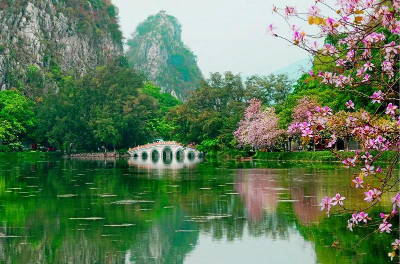 七星岩位于肇庆市区北约2公里处,被誉为“人间仙境”、“岭南第一奇观”,AAAAA级风景游览区。景区由五湖、六岗、七岩、八洞组成,面积8.23平方公里,湖中有山,山中有洞,洞中有河,景在城中不见城,美如人间仙景。五湖是波海湖、中心湖、东湖、里湖、青莲湖;六岗包括象岗、万松岗、黄茅岗、荫梓岗、狮岗;七岩是南面由东到西的阆风岩、玉松岩、石室岩、天柱岩、蟾蜍岩、仙掌岩,北面为阿坡岩,因其排列形状如天上北斗星座,故得名为七星岩;八洞指:龙岩洞(石室洞)、莲花洞、碧霞洞、鹿骨洞、双源洞、金津玉液洞、旋螺洞、出米洞。