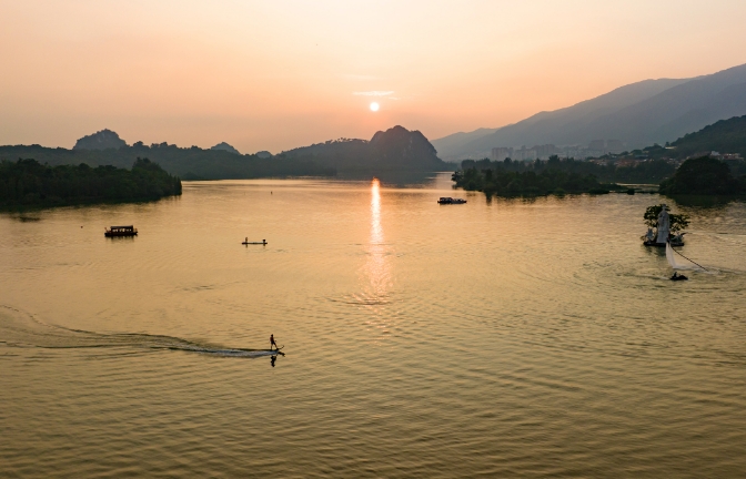星湖“卧佛含丹”是肇庆星湖旅游景区在特定节气和地理位置形成的一种天象奇观。“卧佛”为一象形地貌,由耸...