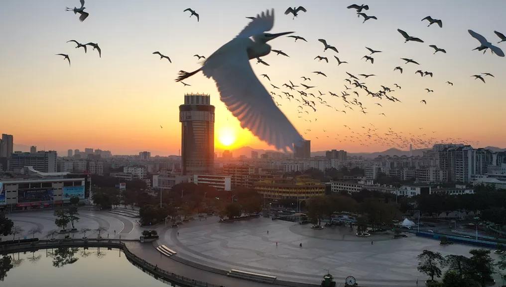 抬头可见!牌坊广场上空白鹭齐飞,太震撼了!